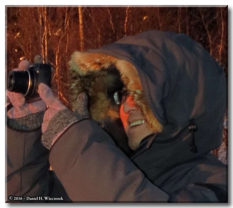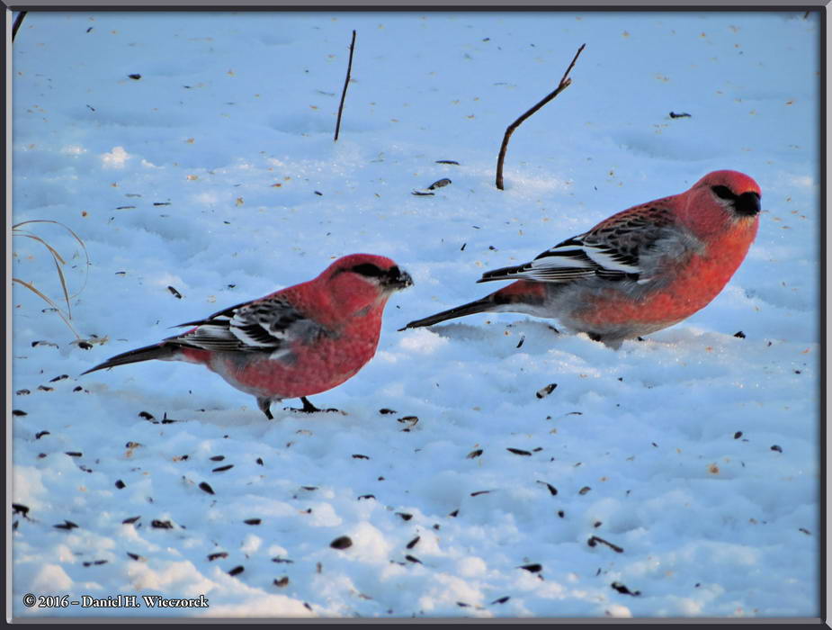 First Photo - Pine Grosbeaks (Pinicola enucleator) picking up seeds below the feeder. Second Photo - Fine Ice Blobs or Crystals in the Air. |