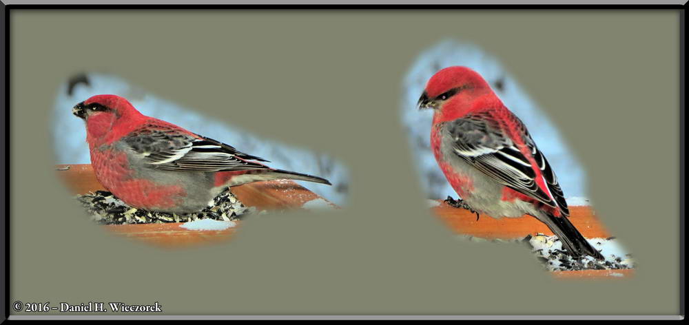 First Photo - The Alternate to this Year's Christmas Letter - First Page Header. Second Photo - A 2-Shot Panorama of our Snowy Yard. Third Photo - Two Pine Grosbeak (Pinicola enucleator) Photos. |