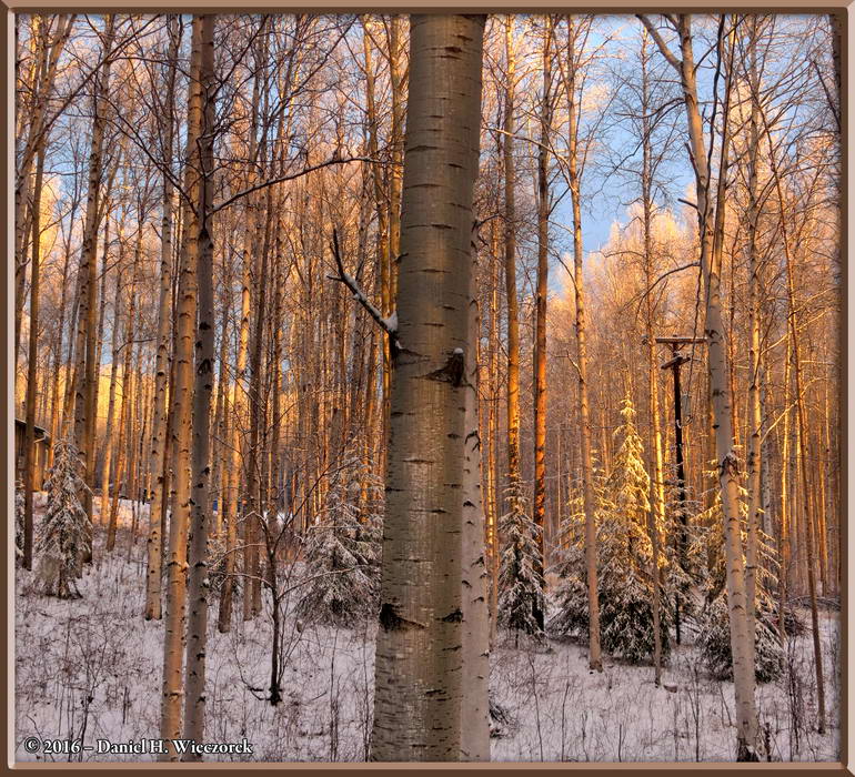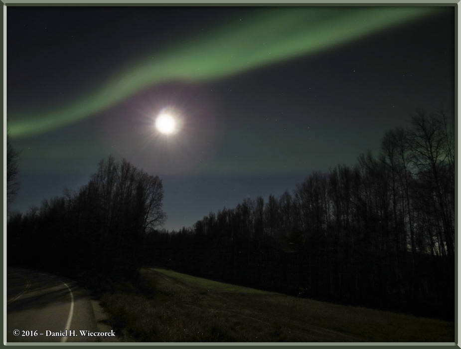 First Photo - From Wickersham Dome - Table Top Mountain and the White Mountains. Second Photo - A Larch Tree in Our Yard - 3-Exposures Tone-mapped. Third Photo - The Aurora Borealis and the Moon from near our House. |