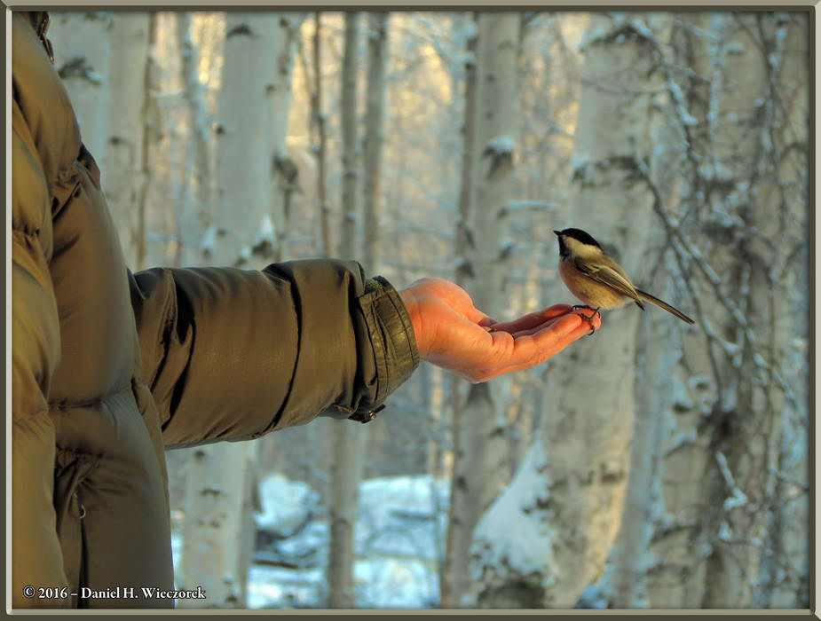 First Photo - Daniel's Freshly Baked Pumpernickel Bread. Second Photo - A 2-shot Panorama of Sunrise Colors in our Yard. Third Photo - Kazuya Hand Feeding a Black-capped Chickadee (Poecile atricapillus). |